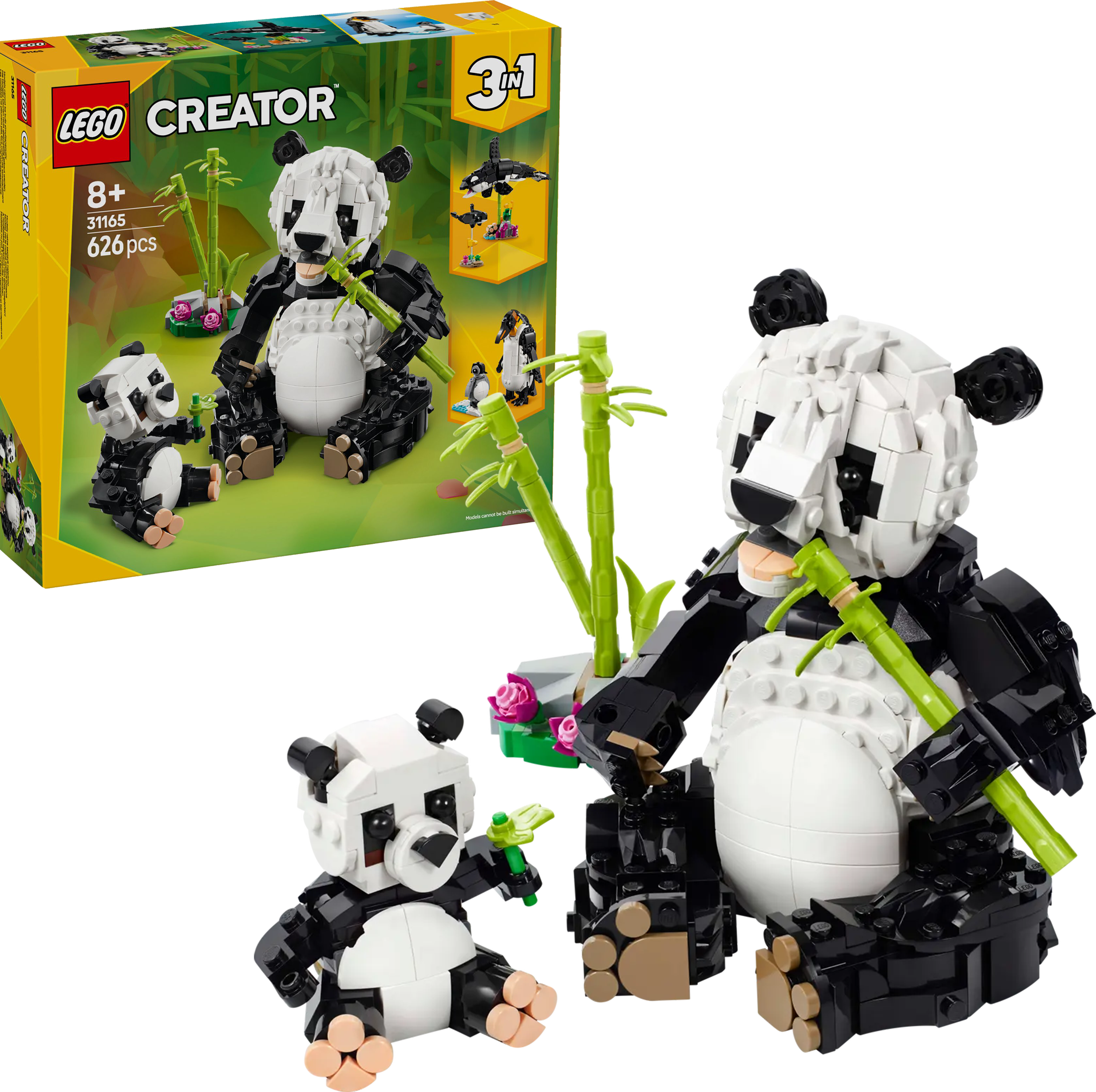 ✅ Dzieci mogą zbudować jeden z trzech modeli LEGO® z tego samego zestawu klocków: ruchomą pandę z młodym obok łodyg bambusa, ruchomą orkę z dzieckiem, które można ustawić na przezroczystych podstawkach lub ruchomego pingwina z pisklęciem na kawałku lodu i wody.