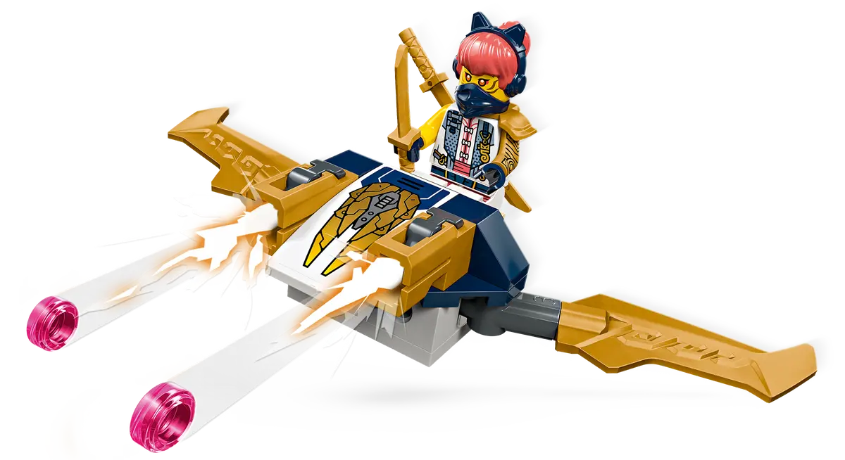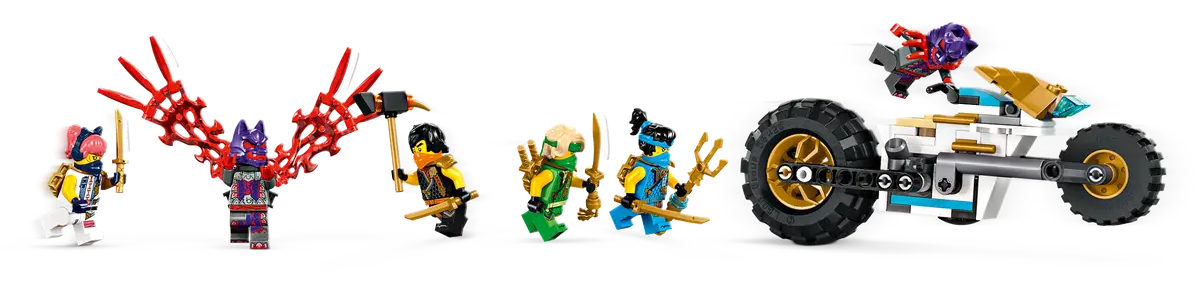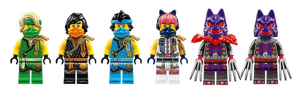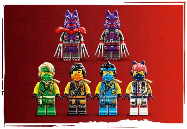 ✅Zestaw z pojazdem obejmuje sześć minifigurek: Sorę, Lloyda, Nyę i Cole’a w specjalnych zbrojach turniejowych z katanami, a także ich wrogów: wojownika wilczej maski i generała wilczej maski.