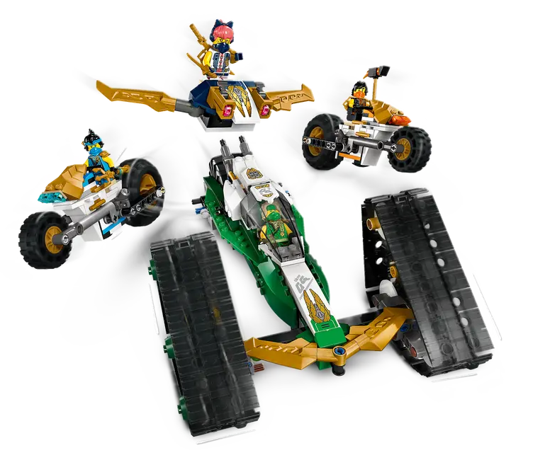 ✅Duży pojazd NINJAGO® można rozłożyć na cztery mniejsze: szybowiec Sory z dwoma miotaczami klocków, terenówkę Lloyda oraz motocykle Cole’a i Nyi