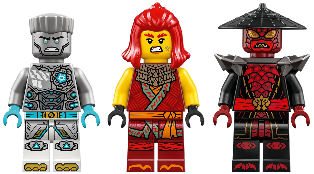 ✅ Ten zestaw LEGO zawiera trzy minifigurki postaci NINJAGO: Zane’a z dwoma shurikenami, Wyldfyre z kryształową kataną i Drixa, Władcę Roju z Zakazanej Piątki, z dwoma sierpami.