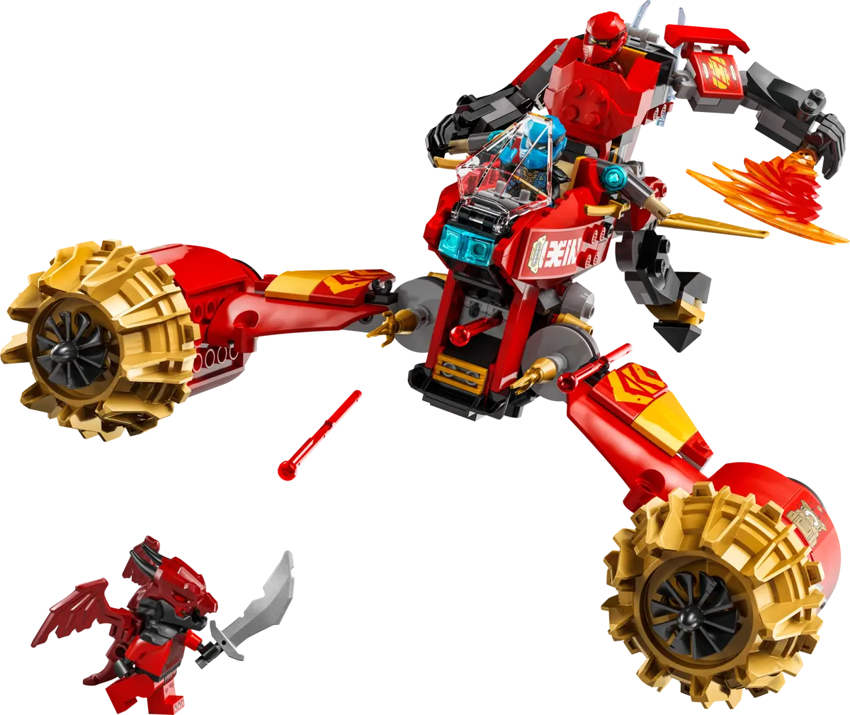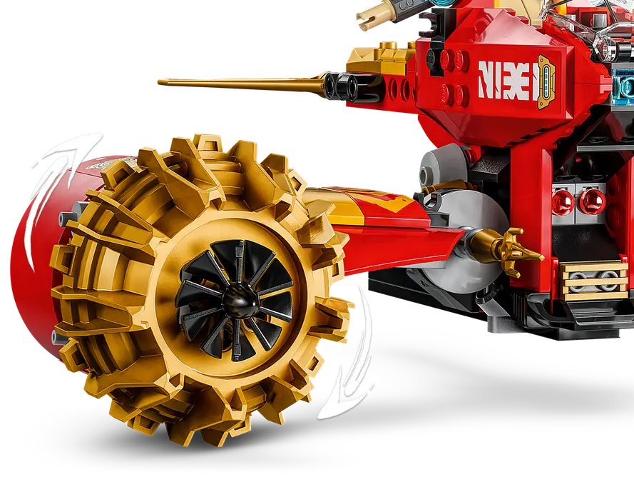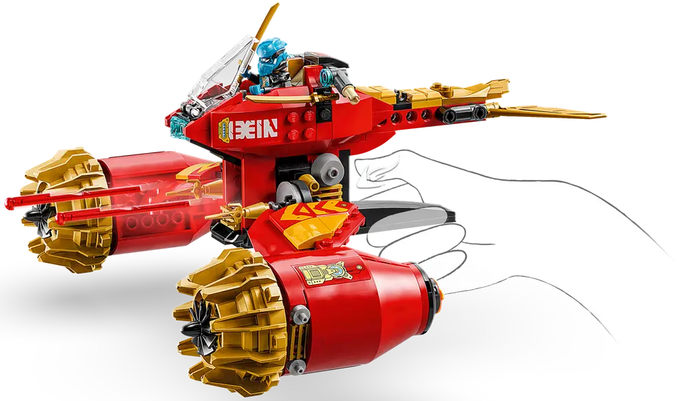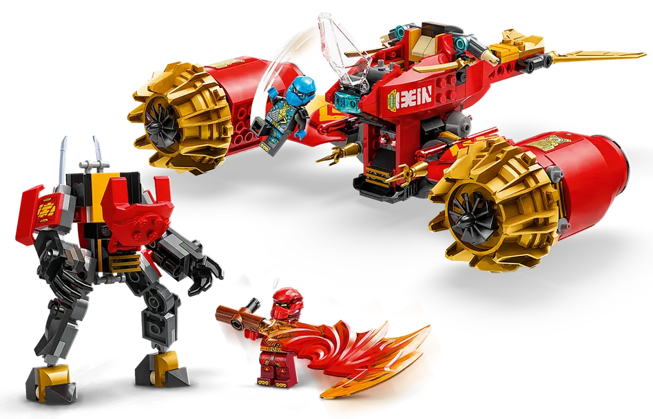 ✅ Dzieci mogą bawić się dużą figurką, a potem rozdzielić ją na dwa mniejsze pojazdy: mecha Kaia z ruchomą głową, ramionami i nogami, kokpitem i dużym ostrzem oraz latający motocykl Nyi z kokpitem, ruchomymi skrzydłami i dwoma sprężynowymi działkami.