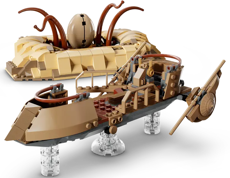 ✅Pustynna barka ma przezroczyste elementy, dzięki którym można uzyskać efekt unoszenia się w powietrzu, oraz fajne detale, takie jak wysuwana deska, po której może chodzić Luke Skywalker, oraz rozkładana poręcz, z której Han Solo omal nie spadł.