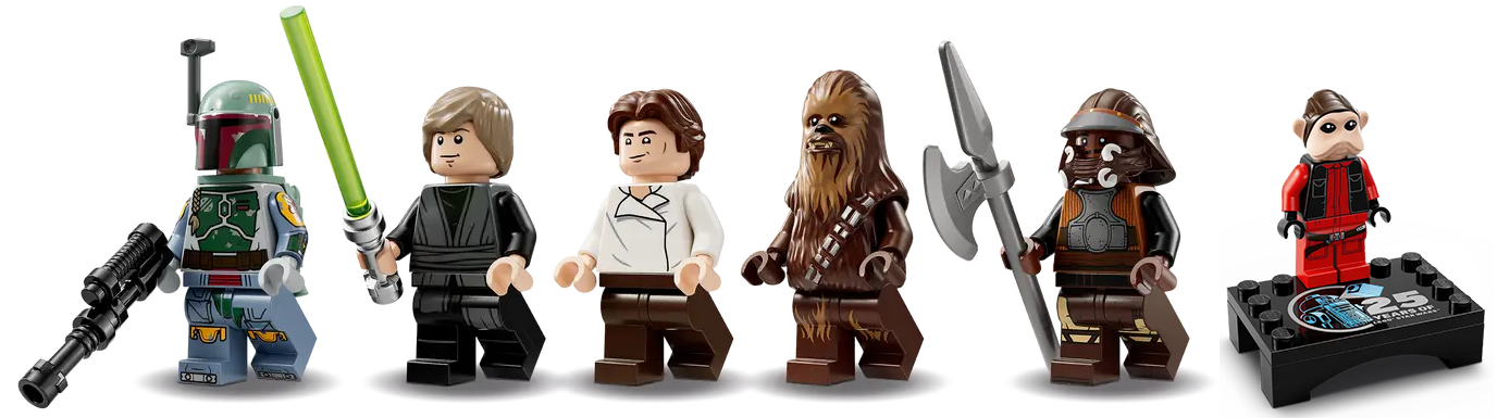 ➡️Luke Skywalker, Han Solo, Chewbacca, Lando Calrissian i Boba Fett z akcesoriami oraz minifigurka Nien Nunba z okazji 25-lecia LEGO Star Wars