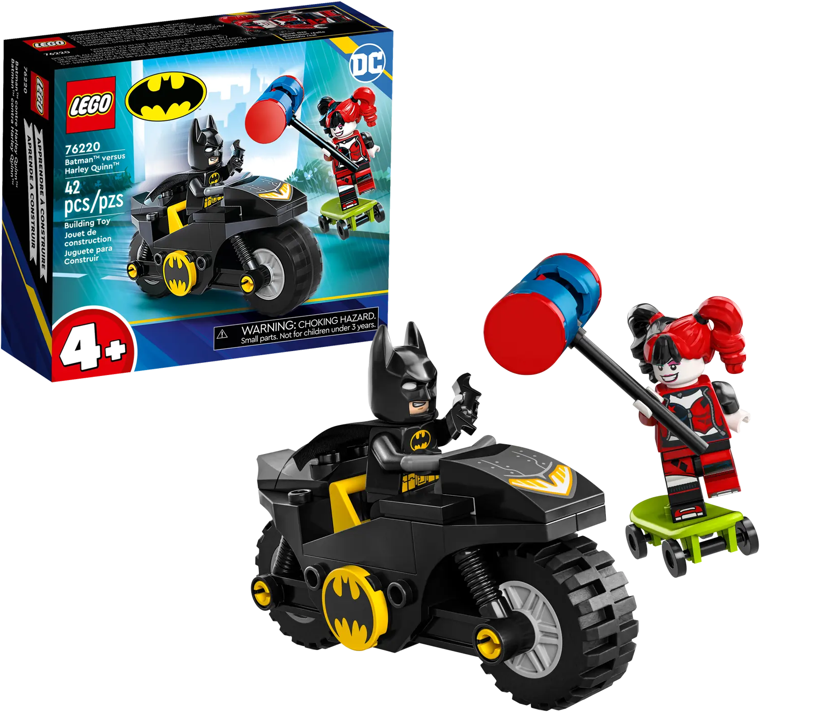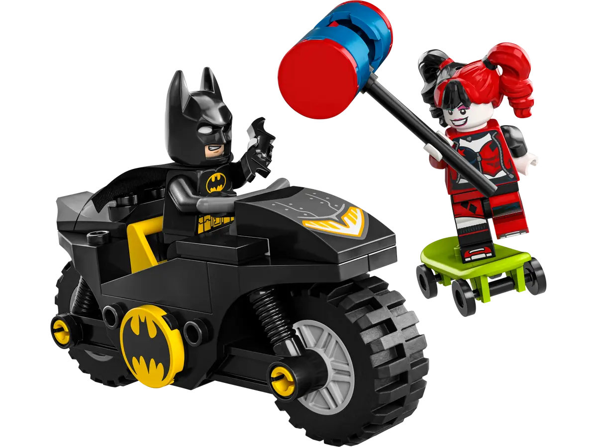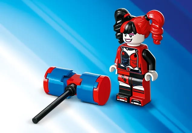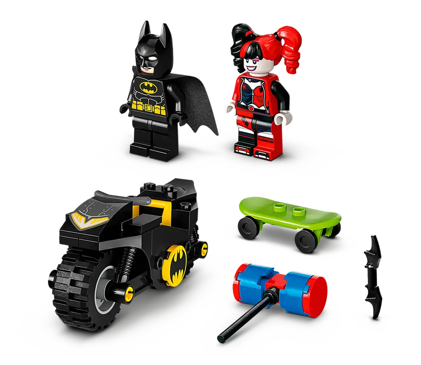 ✅Zestaw z pojazdami obejmuje dwie popularne postacie z filmów z uniwersum DC: Batmana na Batmotorze™ oraz Harley Quinn z młotem na deskorolce.