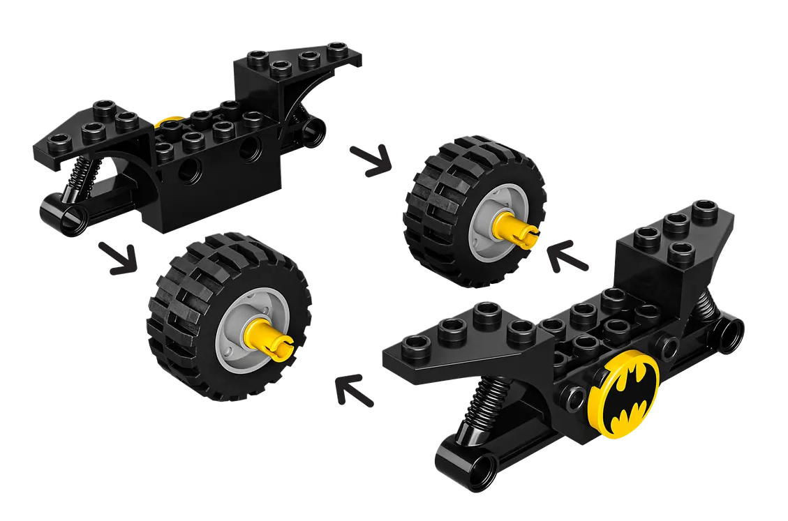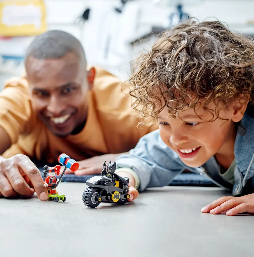 ✅Zestaw obejmuje Batmana™ na Batmotorze™ i z Batarangiem™, a także Harley Quinn™ z deskorolką, młotem i dynamitem. Klocek startowy przyspiesza budowanie, by dzieci mogły się bawić
