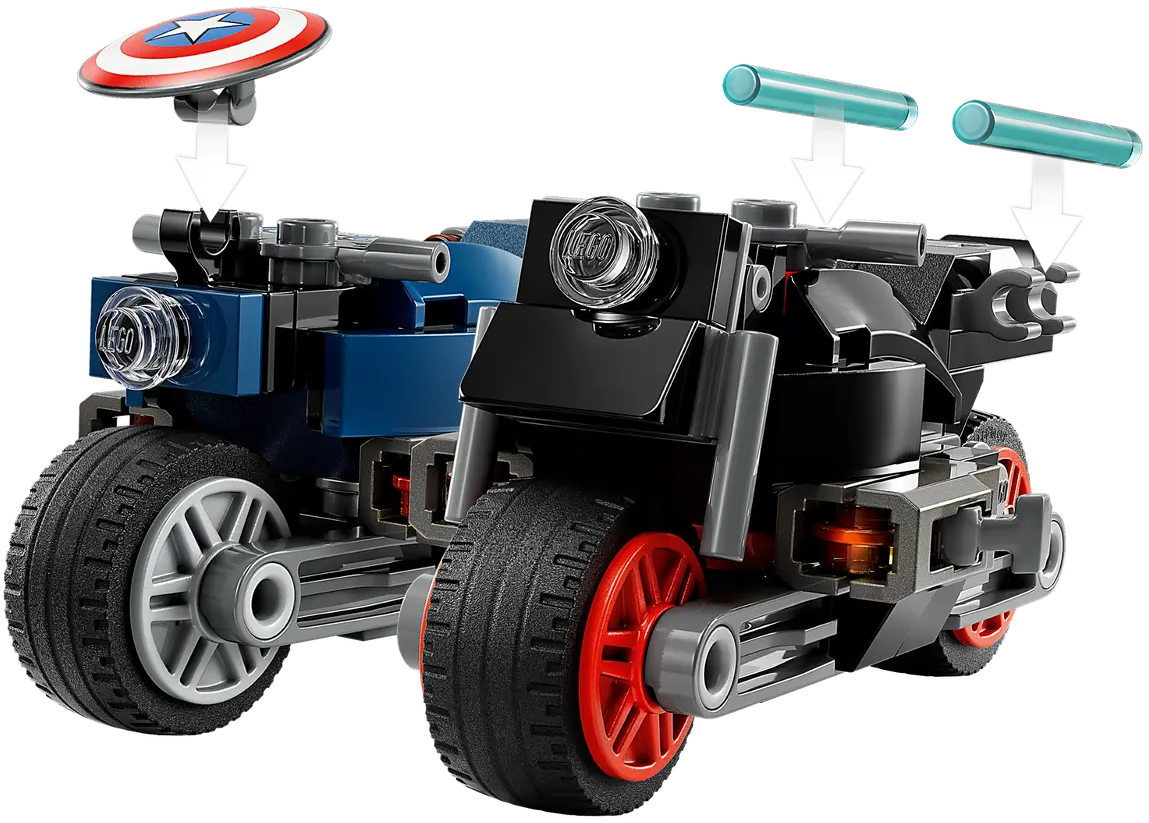 ➡️Zestaw zawiera minifigurki Kapitana Ameryki i Czarnej Wdowy z tarczą i pałką, a także dwa motocykle do zbudowania