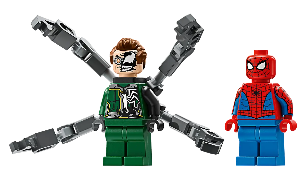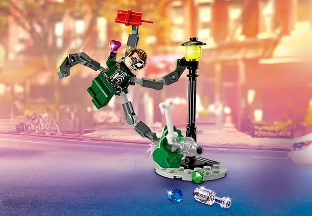 ✅W zestawie są minifigurki LEGO Doc Ocka i Spider-Mana. Doc Ock ma cztery długie, elastyczne macki i nosi charakterystyczne znamiona Venoma, który opanował złoczyńcę, czyniąc go jeszcze bardziej podłym. Minifigurki mogą chwytać się innych elementów, w tym latarni ulicznej, dynamitu i kosza na śmieci zawierającego butelkę, rybę, kość i skórkę banana.
