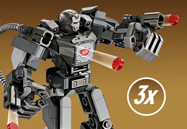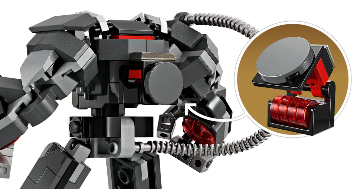 ✅Korpus mecha otwiera się, ukazując kokpit dla minifigurki pilota, War Machine. W zestawie są trzy miotacze klocków — jeden na ramieniu mecha i dwa na rękach — a z tyłu mecha znajduje się schowek na dodatkową amunicję.