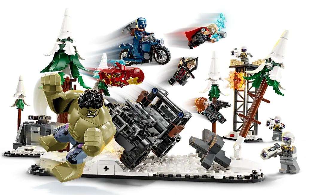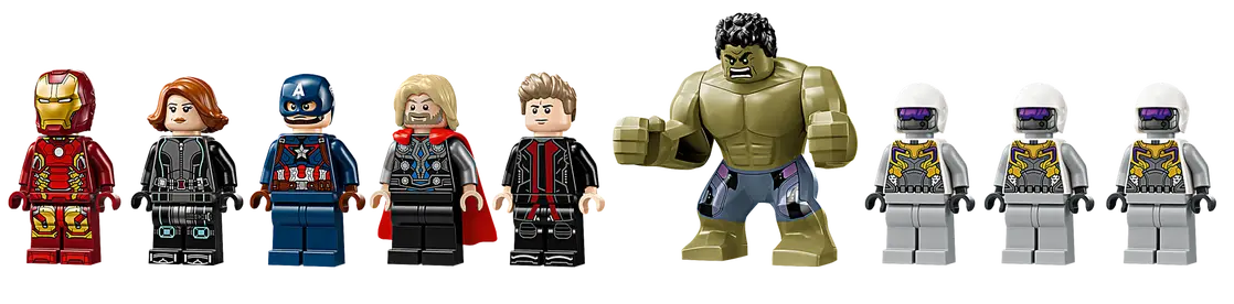✅Zestaw odtwarza scenę wielkiej bitwy z hitowego filmu Avengers: Czas Ultrona Marvela. Obejmuje pięć minifigurek Avengersów — Hawkeye’a, Czarnej Wdowy, Kapitana Ameryki, Iron Mana i Thora— dużą figurkę Hulka oraz trzy minifigurki żołnierzy Hydry.