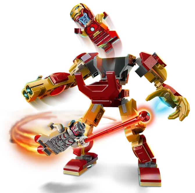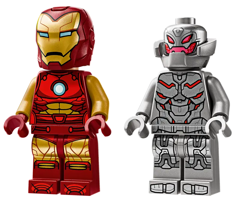 ✅ Ten zestaw LEGO Marvel z mechem zawiera dwie minifigurki: Iron Mana z otwieranym kaskiem i głową z różnymi minami oraz Ultrona trzymającego broń laserową.