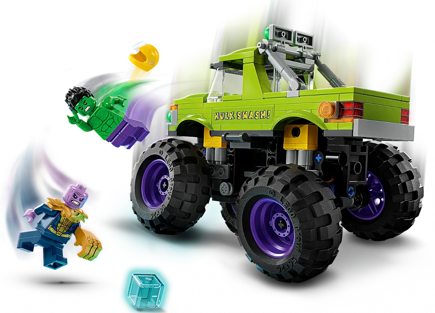 ✅ Potężny monster truck LEGO ǀ Marvel do zbudowania zawiera minifigurkę Hulka ze zdejmowanym hełmem i minifigurkę Thanosa z Tesseraktem i Rękawicą Nieskończoności.