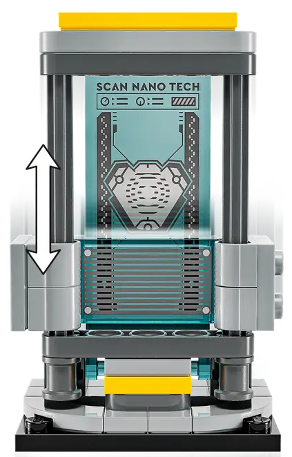 ➡️ Laboratorium zawiera trzy kapsuły ze zbrojami, platformę serwisową z dwoma robotycznymi ramionami oraz duże urządzenie skanujące i dwa miotacze klocków do odgrywania bitew