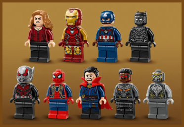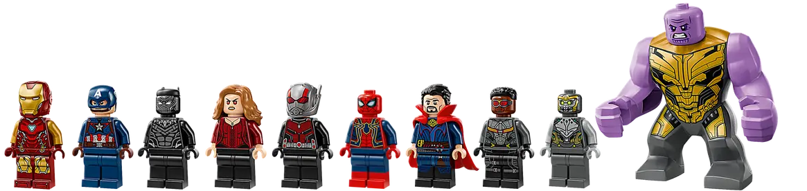 ✅ Minifigurki Kapitana Ameryki, Czarnej Pantery, Iron Mana, Scarlet Witch,Ant-Mana, Żelaznego Pająka, Doktora Strange’a, Falcona i Chitauri, a także figurka Thanosa i mech Ant-Mana