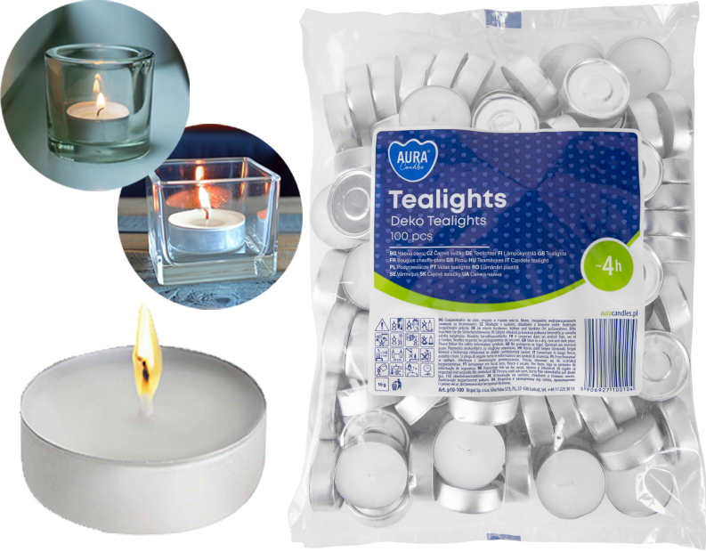 ⭐AURA Podgrzewacze Tealights Deko 4h 100 szt. p10-100⭐