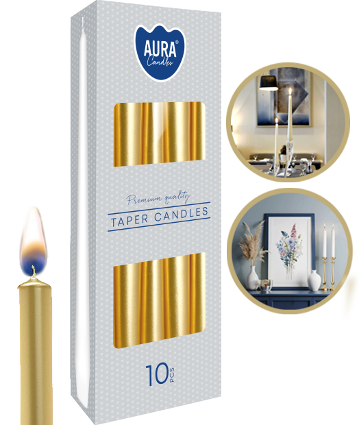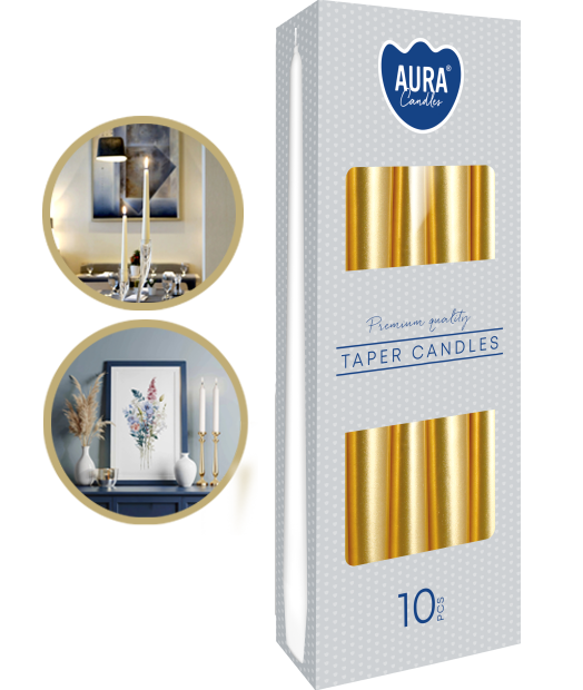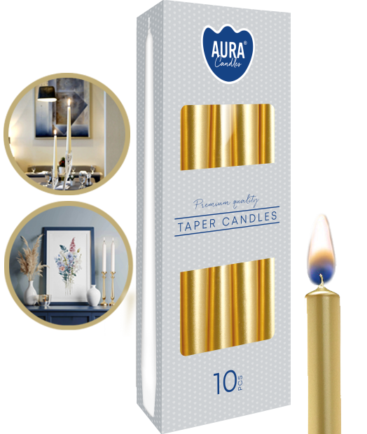 ✅Odkryj bogactwo i ciepło złotego metaliku z eleganckimi świecami stożkowymi AURA.