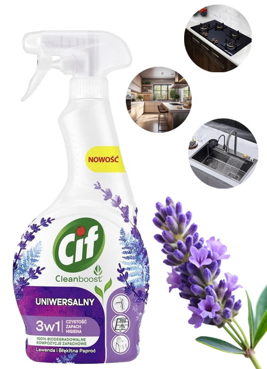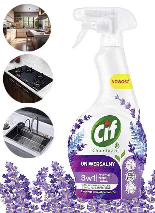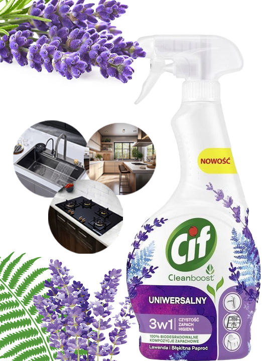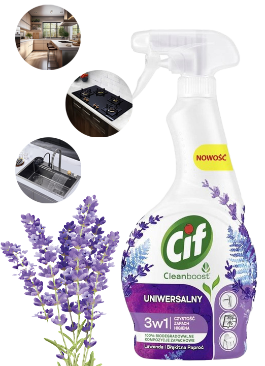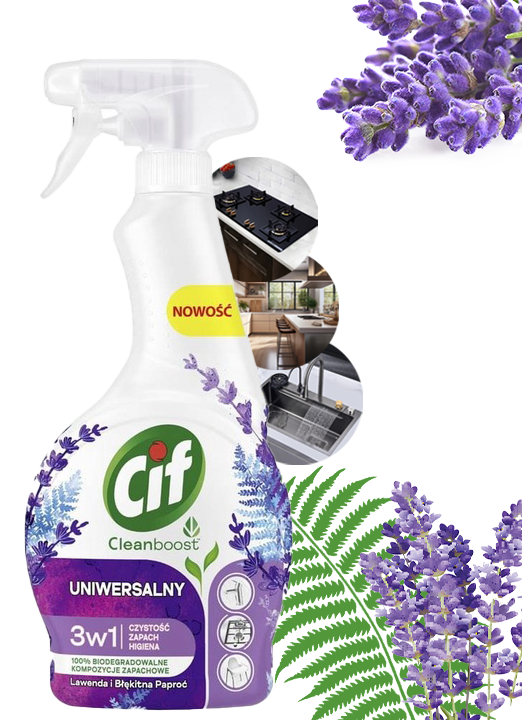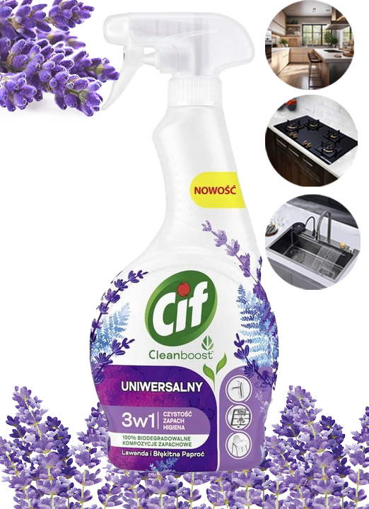 ✅Odkryj wszechstronność i skuteczność CIF Cleanboost Uniwersalny 3w1 Spray Czyszczący, który łączy w sobie najwyższą jakość czyszczenia z relaksującym zapachem lawendy i błękitnej paproci.