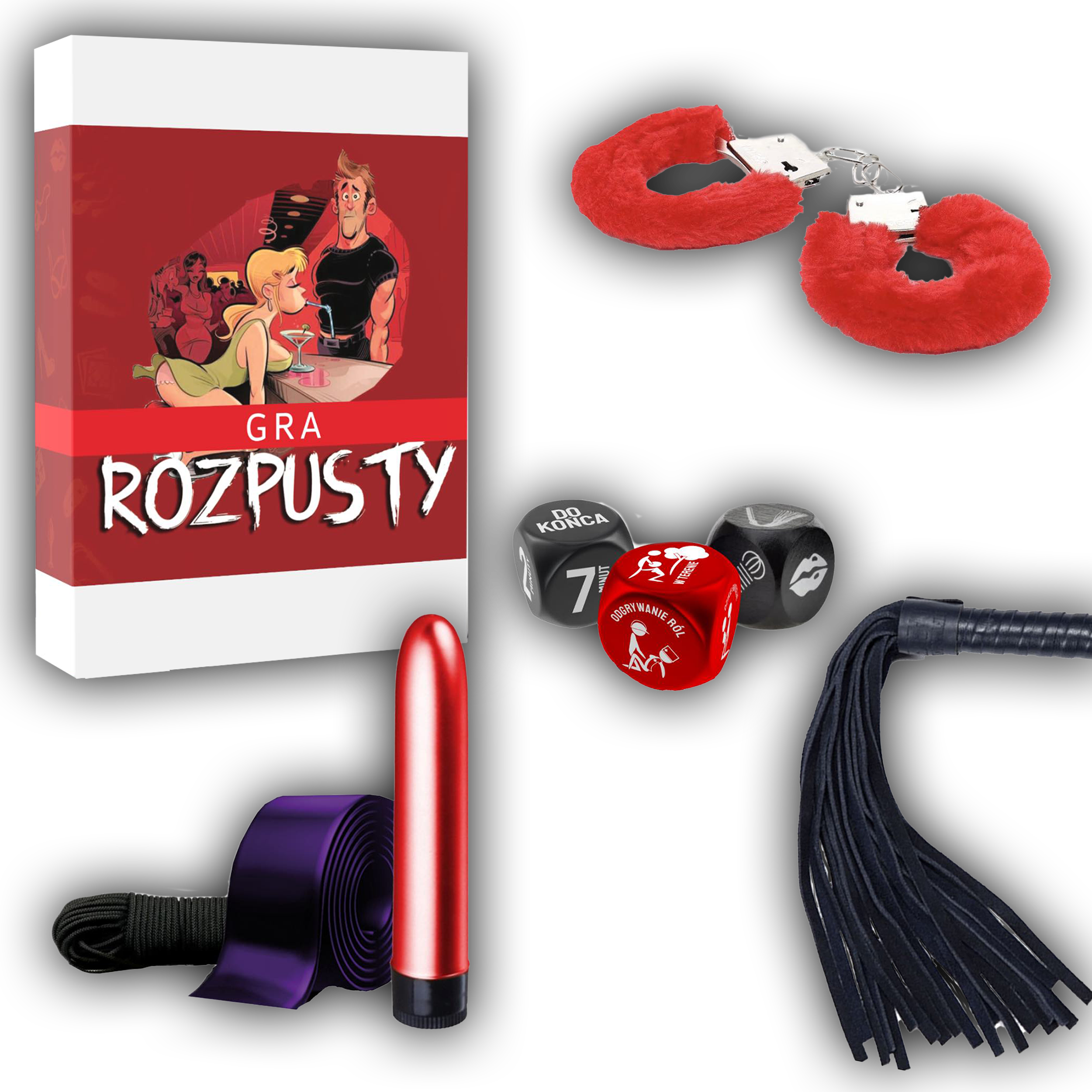 ✅ W komplecie znajdziesz zestaw akcesoriów erotycznych, w tym m.in. kajdanki z futerkiem, wibrator, pejcz, opaskę na oczy, sznur oraz kości z zadaniami, które pomagają losować kolejne wyzwania.