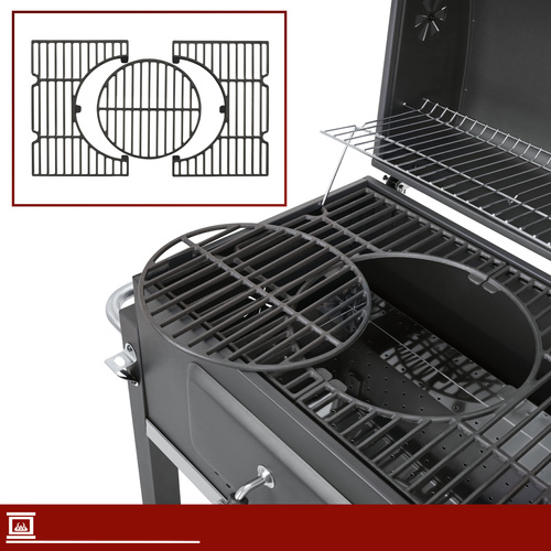 ➡️ Żeliwny ruszt główny dobrze trzyma ciepło i wspiera równomierne grillowanie.