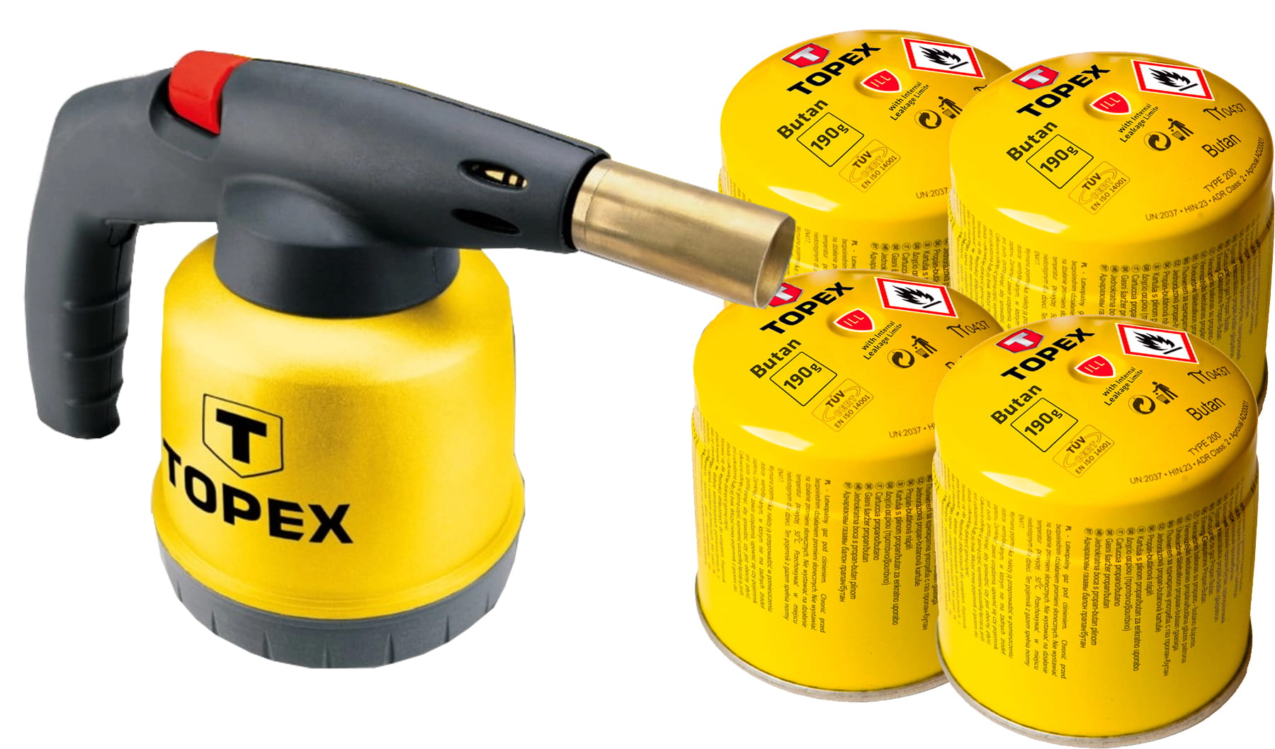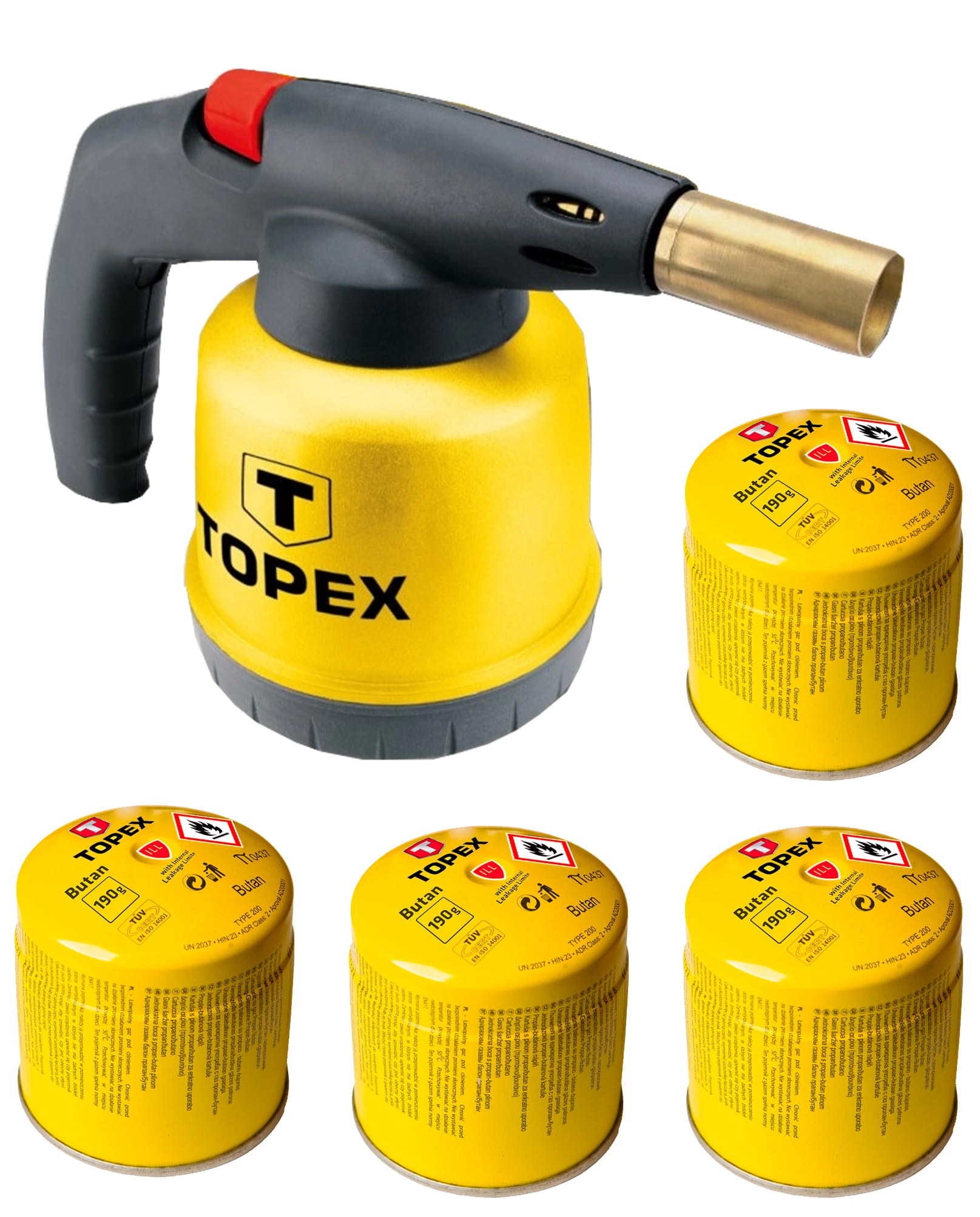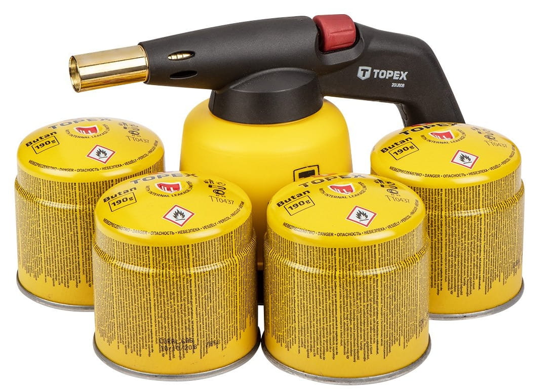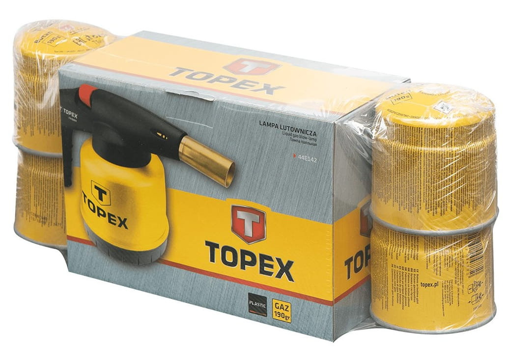 ✅ W jego skład wchodzi lampa lutownicza gazowa oraz cztery naboje z gazem butan o pojemności 190 g każdy, wyposażone w zaworek ułatwiający podłączenie i użytkowanie.