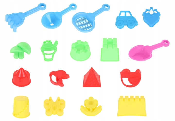✅Zestaw zawiera 14 foremek, grabki, sito, łopatkę i lejek