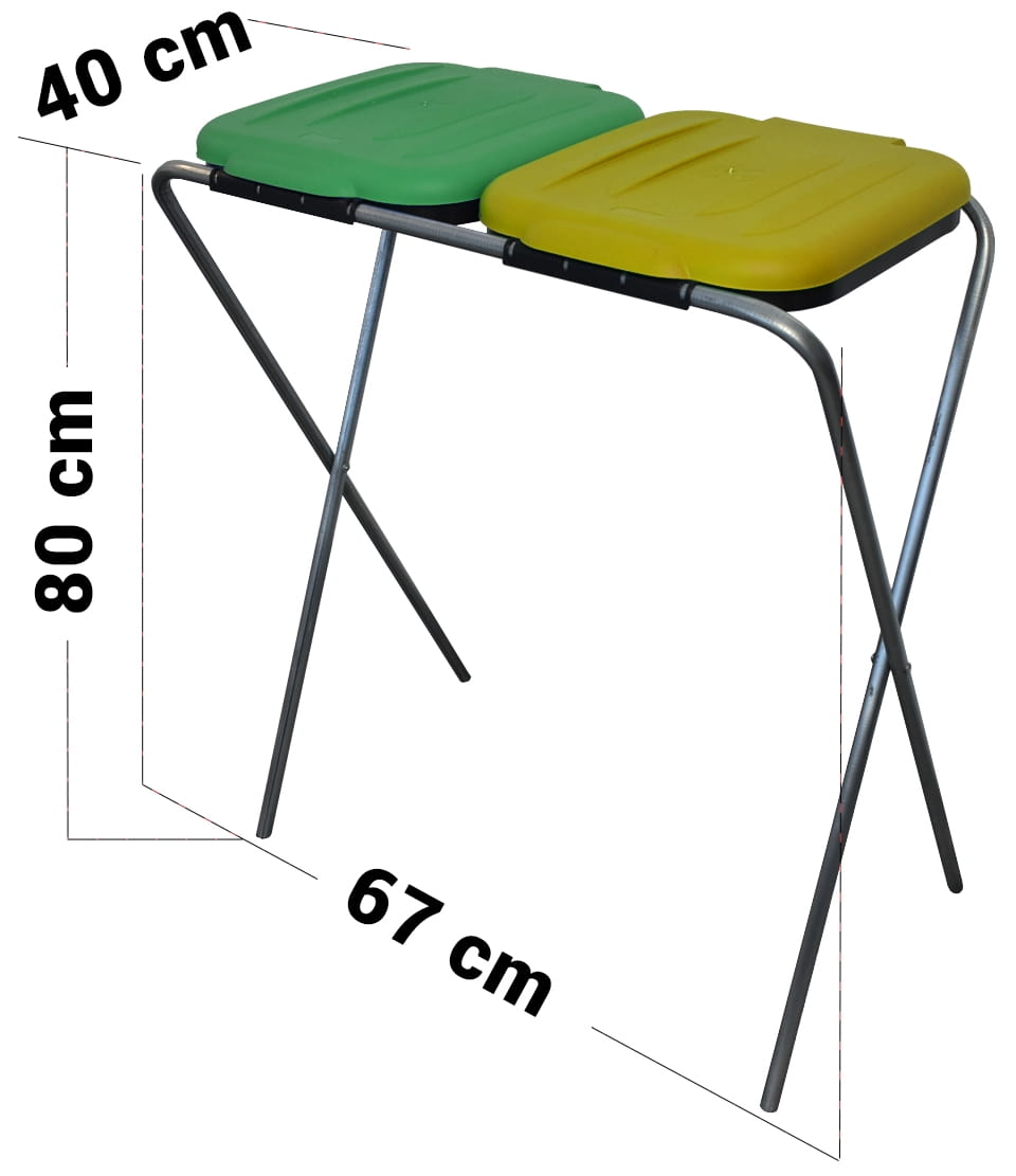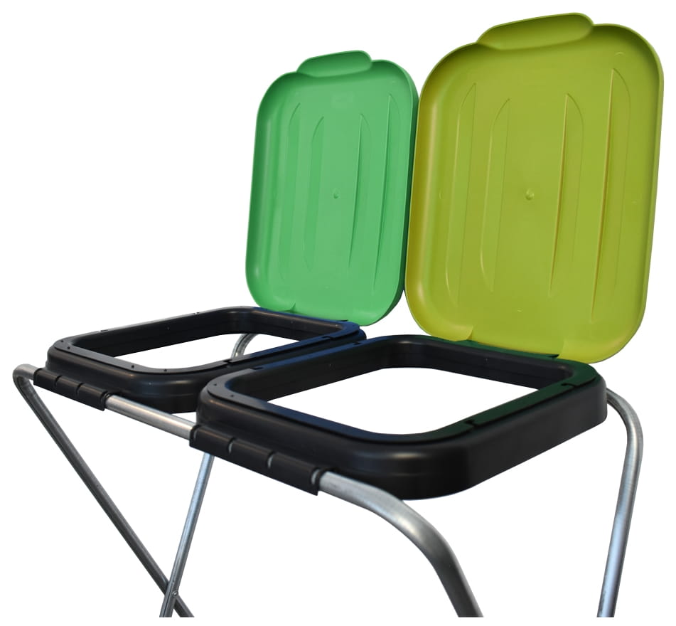 W stojaku zamontowane są dwie pokrywy oraz pod nimi czarna obręcz służąca do mocowania i przytrzymywania worków w stelażu. W stojakach można stosować worki o pojemności 120 litrów.