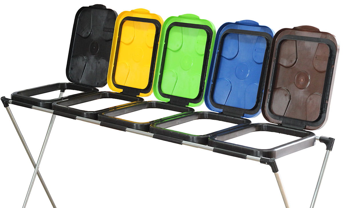 Stojak na śmieci z pięcioma pokrywkami w kolorach: żółty, zielony, niebieski, brązowy i czarny, umożliwia segregację odpadów na papier, szkło, plastik, odpady BIO, oraz odpady zmieszane.