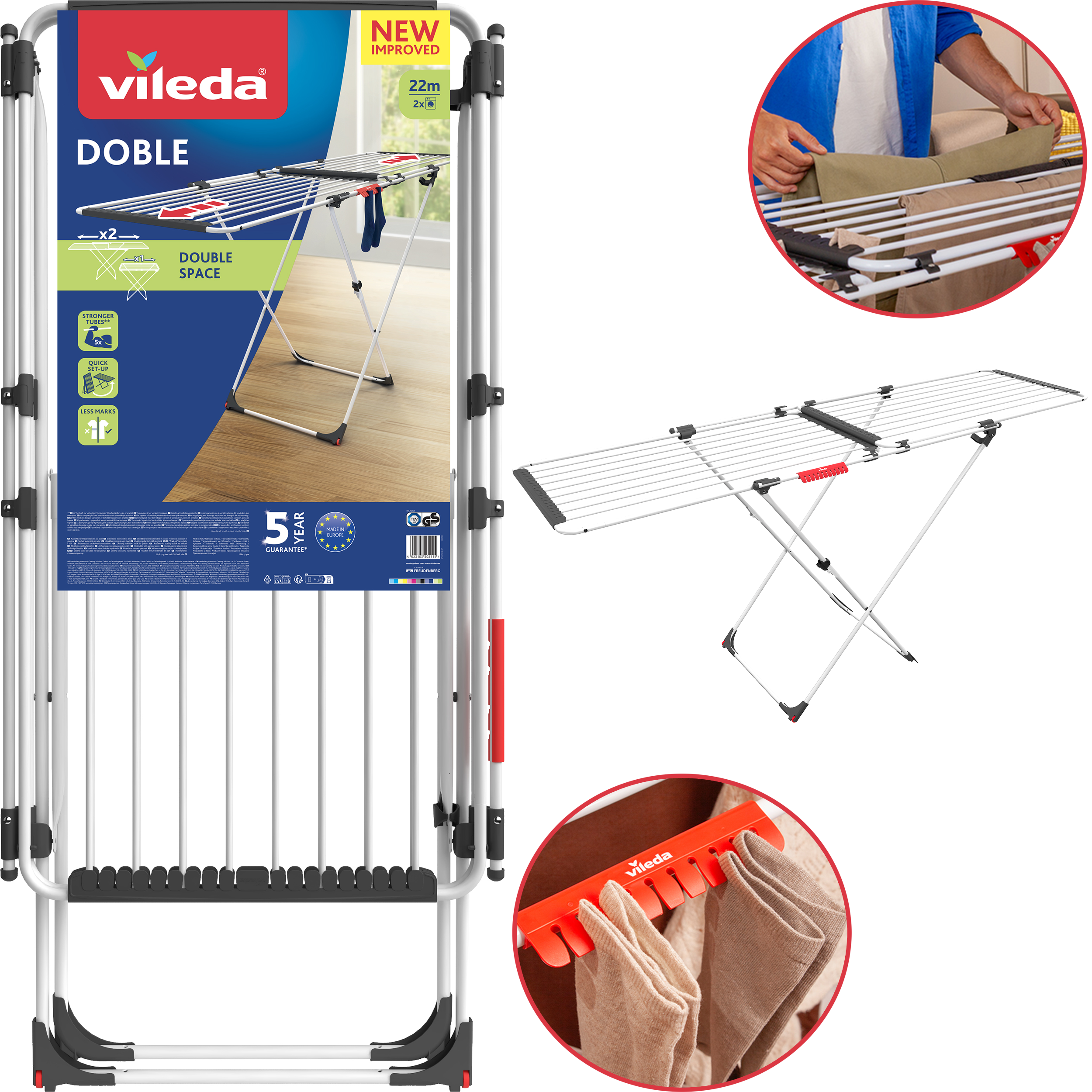 ➡️ Nogi w kształcie litery X i składana konstrukcja suszarki Vileda Doble dają możliwość złożenia suszarki na płasko w celu kompaktowego przechowywania.