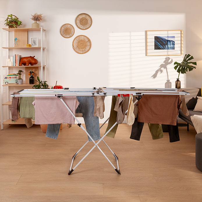 ✅ Nogi w kształcie litery X sprawiają, że rozkładanie suszarki jest bardzo wygodne, bez konieczności schylania się.