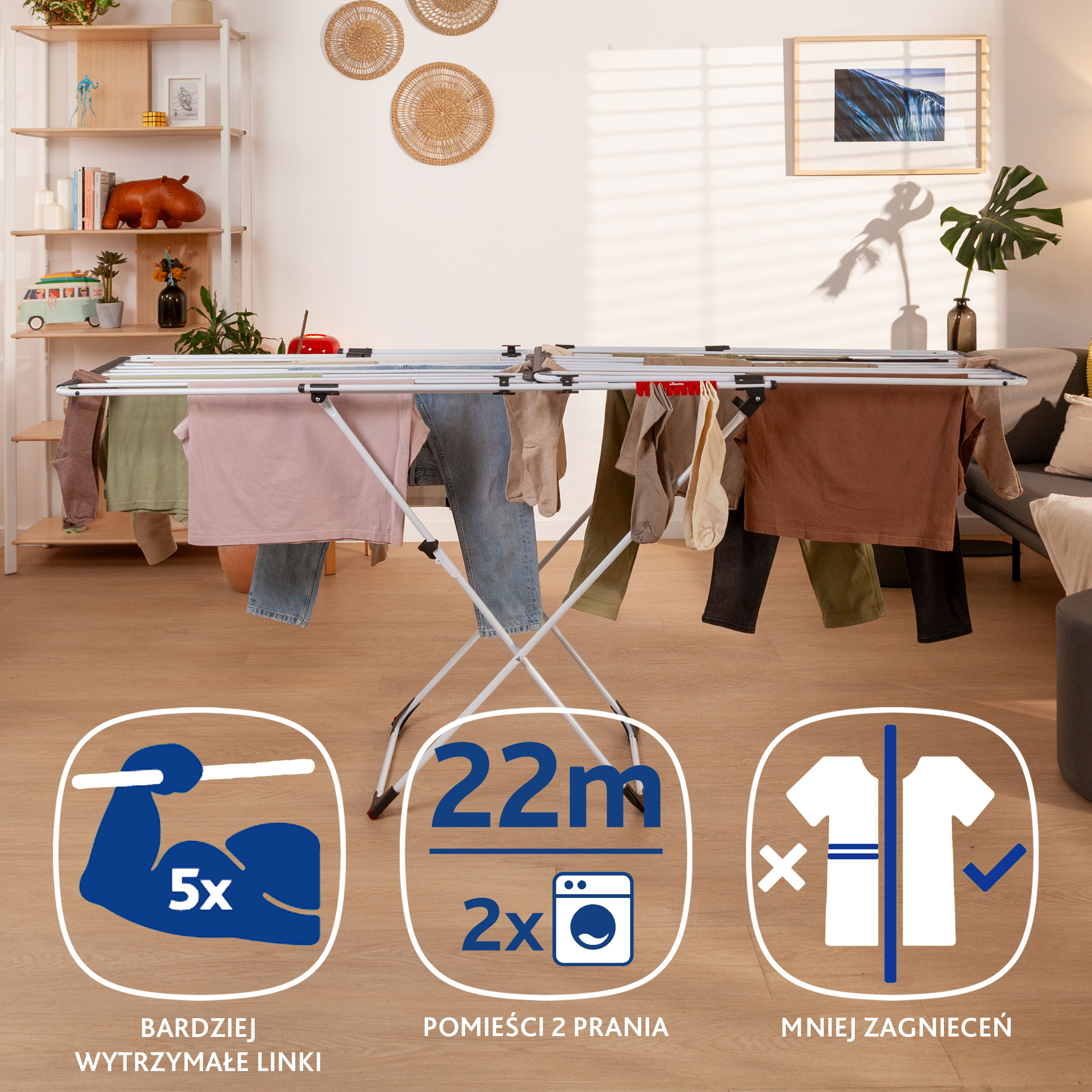 ➡️ Te grube linki zostawiają mniej śladów na praniu niż standardowe suszarki i przyspieszają proces prasowania.