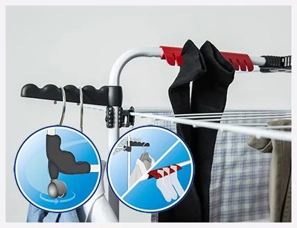 Pionowa suszarka na pranie Vileda na kółkach z dodatkowymi uchwytami na wieszaki – gwarantuje oszczędność miejsca.