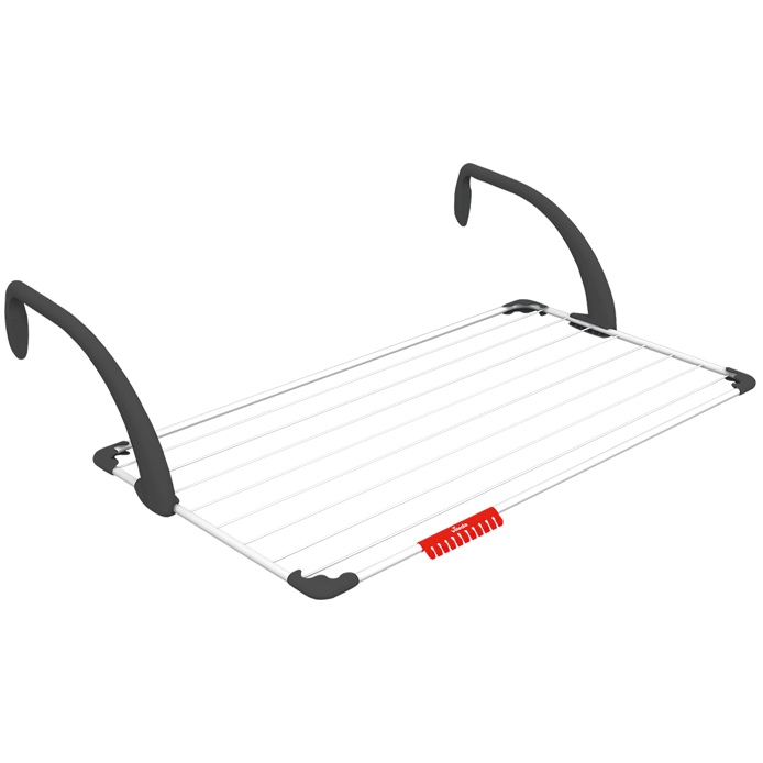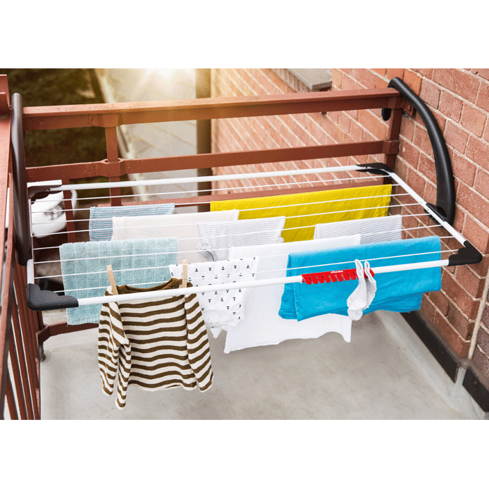 W dowolnym miejscu na balkonie lub w mieszkaniu. Regulowane ramiona zapewniają maksymalną elastyczność podczas montażu. W zależności od upodobań suszarkę można zawiesić nisko lub wysoko – szczególnie praktyczne w przypadku dużych rzeczy do prania.