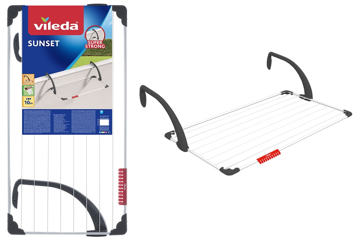 Aby złożyć suszarkę balkonową Vileda Sunset, wystarczy ustawić ramiona i ją powiesić. Może to być na balkonie lub nawet w mieszkaniu przy oknie.