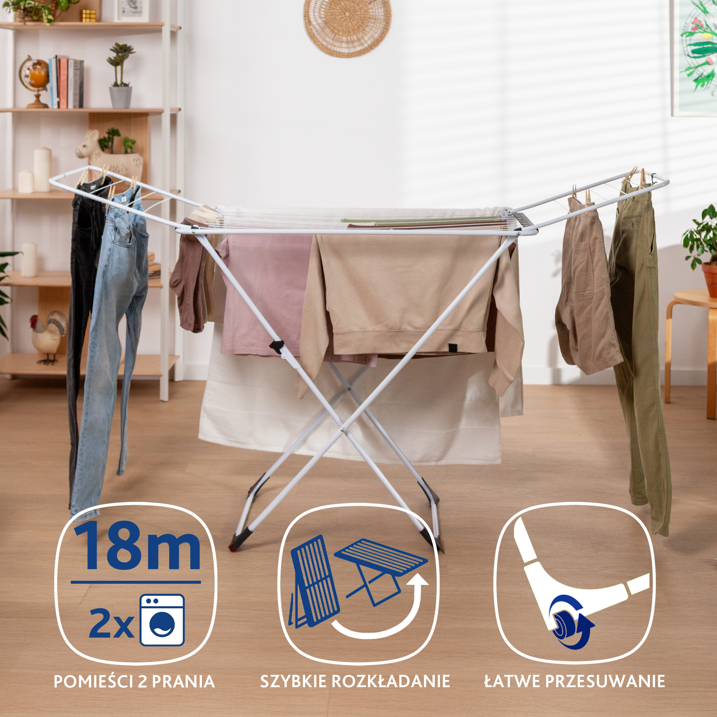 ➡️ Składane nogi w kształcie litery X sprawiają, że rozkładanie suszarki jest niezwykle proste.